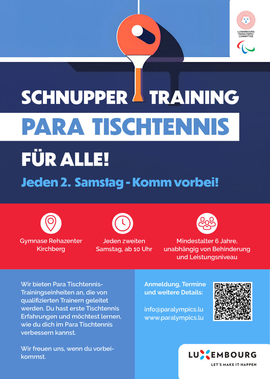 Marc Schreiner, Präsident des Luxembourg Paralympic Committee hofft auf eine rege Teilnahme und einen langfristigen Effekt: „Tischtennis ist eine der größten Sportarten im paralympischen Programm und eröffnet vielen Menschen mit Behinderungen ein großartiges Angebot. Tischtennis ist eine der wenigen paralympischen Sportarten, in der es für fast alle klassifizierbare Behinderungsarten Startklassen gibt und wir erhoffen uns, langfristig über das Schnuppertraining talentierte Tischtennisspieler mit Behinderung zu entdecken und fördern zu können.“